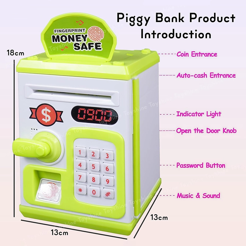 Fun and educational electronic piggy bank ATM for kids with password protection, note & coin slot and mini money safe box design. Encourages saving habits while offering interactive play.