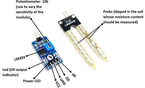 The soil moisture sensor is commonly used in smart agriculture or other garden automation projects to measure the moisture content present in the soil. It consists of 4 pins in which two pins, Vcc and Gnd are connected to supply voltage. The remaining two pins are digital (D0) and analog (A0) are the output pins. When the moisture content present in the soil goes beyond the threshold level, the output of the digital pin (D0) will go low (the output of the digital pin is either logic 0 or 1). The threshold value of the sensor module can be set by varying the onboard potentiometer. The analog output pin can be used to calculate the approximate level of moisture content present in the soil.
